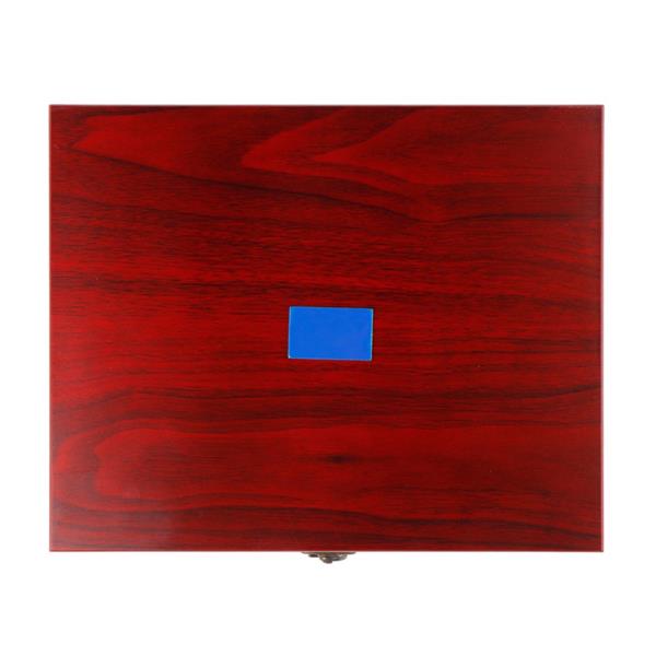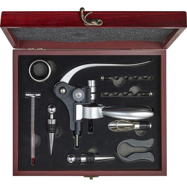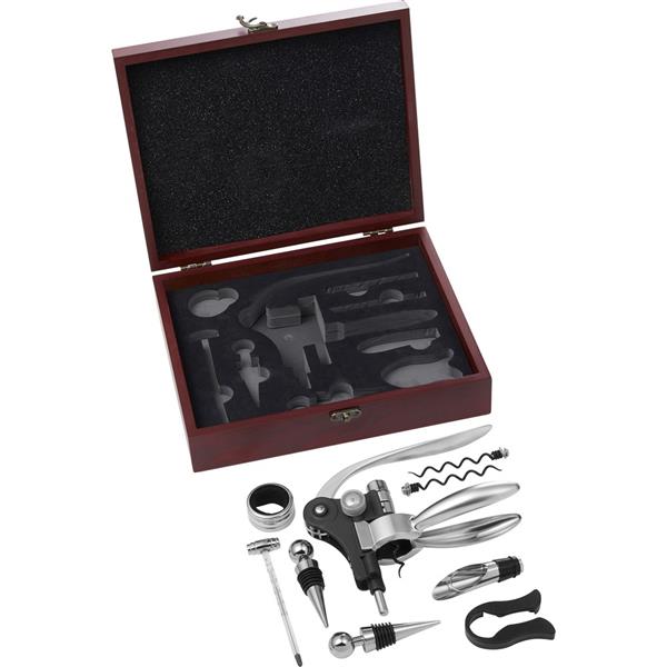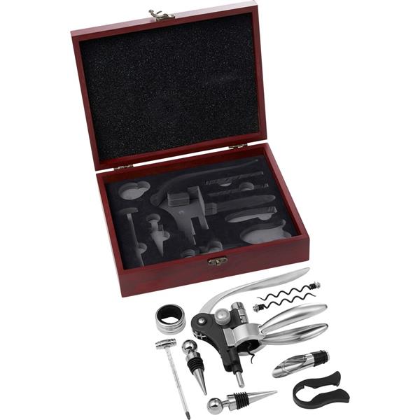 Zestaw do wina 7 el. w drewnianym pudełku, zawiera: 2 zatyczki, pierścień, termometr, nóż do folii, lejek i korkociąg