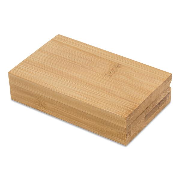 Zestaw do wina w pudełku z drewna bambusowego. W skład wchodzi otwieracz do wina oraz zatyczka do butelki.