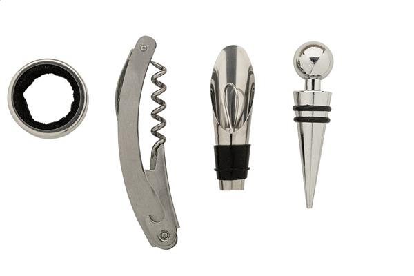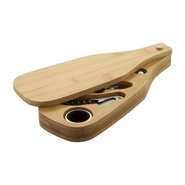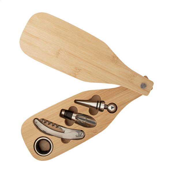 4-częściowy zestaw do wina ze stali nierdzewnej w bambusowym pudełku w kształcie butelki. Zawiera korkociąg, ociekacz, lejek i zatyczkę.