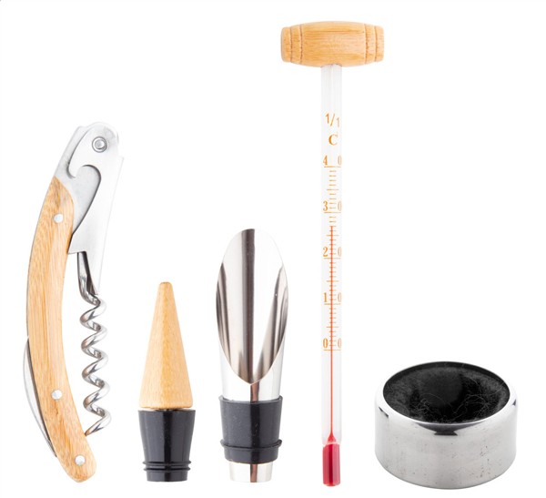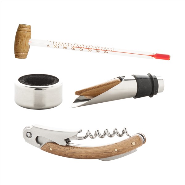 Zestaw do wina z 4 akcesoriami z drewna inkrustowanego w bambusowym pudełku.