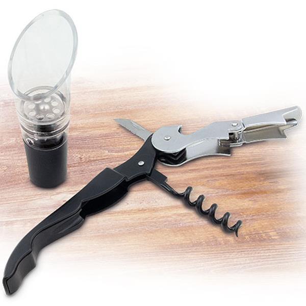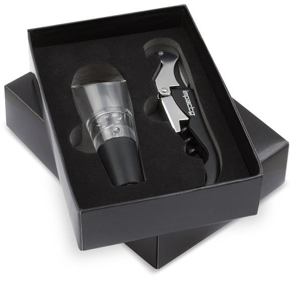 Zestaw: nóż kelnerski i nalewak ze stali nierdzewnej, w pudełku prezentowym. Rozmiar: 10 x 14 x 3,5 cm L2 (grawer laserowy): 3 x 0,5 cm Kolor: Czarny