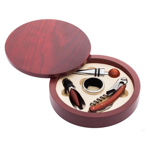 Zestaw do wina składający się z otwieracza, okapnika, nalewaka i zatyczki.