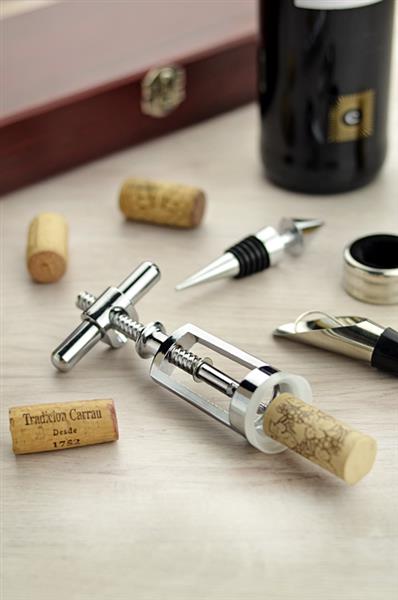 Zestaw do wina składający się z korkociągu, 2 zatyczek (jedna z funkcją nalewaka), obrączki na szyjkę butelki zabezpieczającej przed kapaniem. Całość zapakowana w eleganckie drewniane pudełko. Logo wygrawerujemy na pudełku.