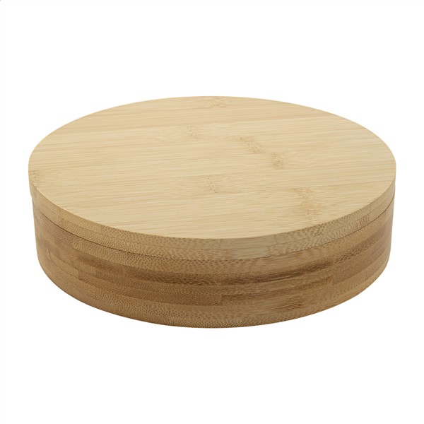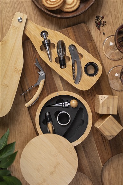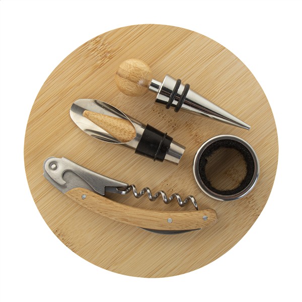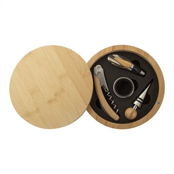 4-elementowy bambusowy zestaw do wina ze stali nierdzewnej w okrągłym bambusowym pudełku. Zawiera korkociąg, ociekacz, lejek i zatyczkę.