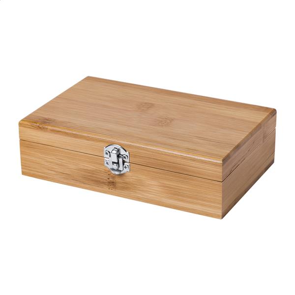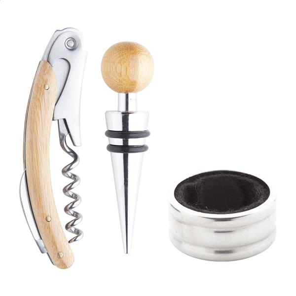 Bambusowy zestaw do wina z otwieraczem, ociekaczem i korkiem. W bambusowym etui.