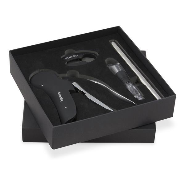 Czteroelementowy zestaw do wina, wykonany ze stali nierdzewnej. Zawiera wkład chłodzący, korkociąg, nalewak i nożyk do folii, w pudełku prezentowym.