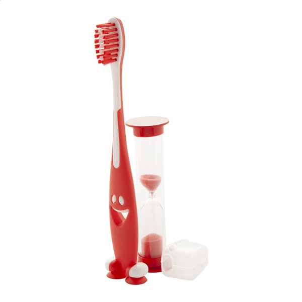 Zestaw do zebów dla dzieci z plastikową szczoteczką, timerem piasku oraz zamykanym na zamek plastikowym opakowaniu.