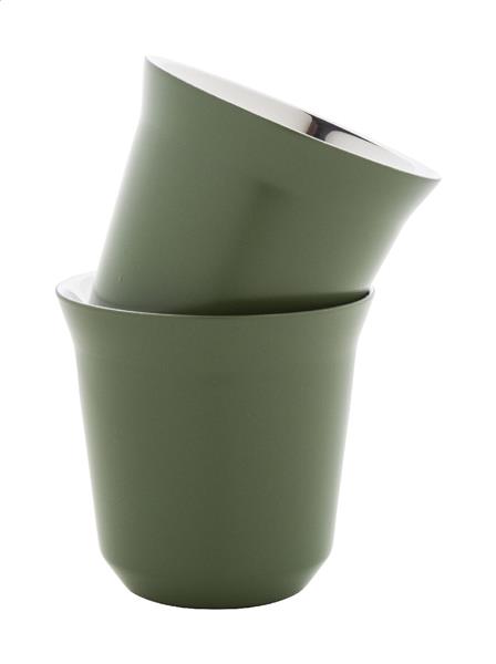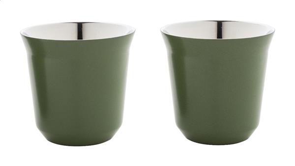 Zestaw 2 filiżanek do espresso w kształcie kapsułkek, z podwójnymi ściankami, wykonane z recyklingowanej stali nierdzewnej, 80 ml. W pudełku z papieru typu kraft.