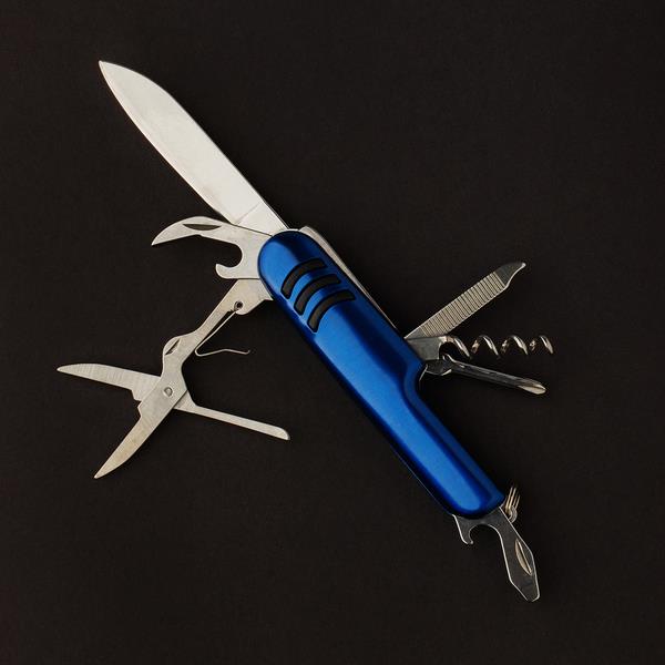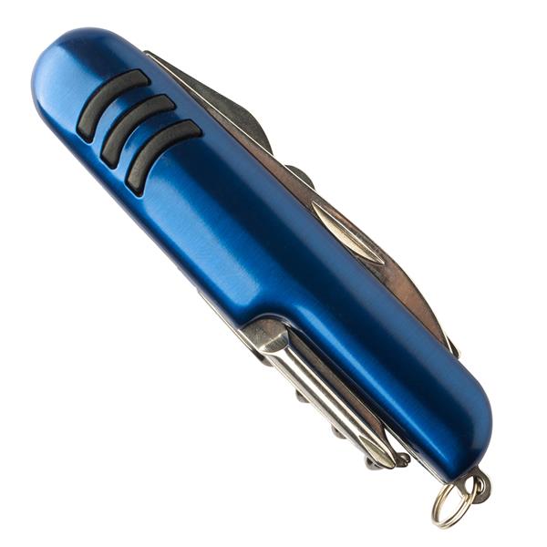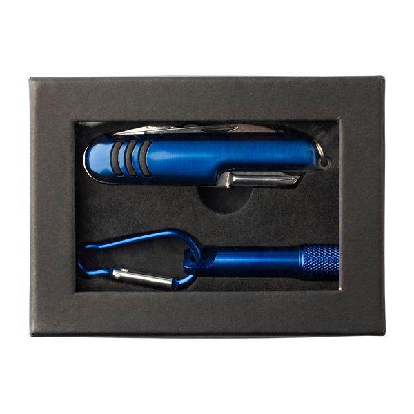 Zestaw składający się z 9-funkcyjnego scyzoryka z ostrzem ze stali nierdzewnej oraz latarki z karabińczykiem. Latarka zasilana jest 4 bateriami typu LR41 (dołączone). Zestaw zawiera nóż, wkrętak PH krzyżowy, pilnik, korkociąg, wkrętak płaski, otwieracz do butelek, nożyczki, otwieracz do konserw oraz oczko do troczenia. Pakowany w upominkowe opakowanie.