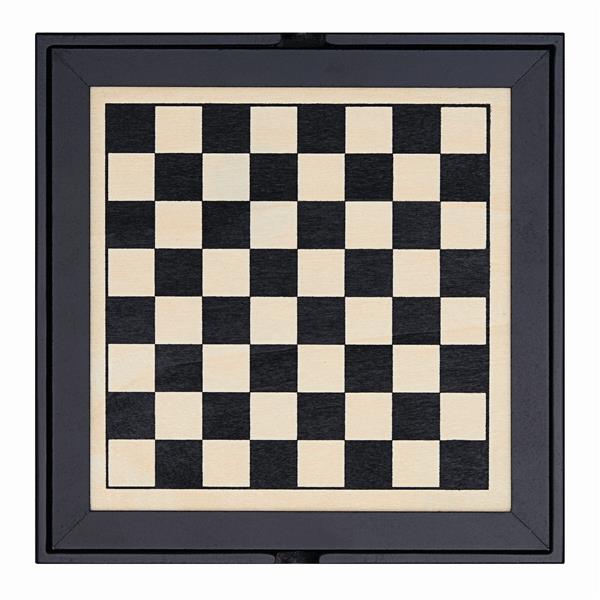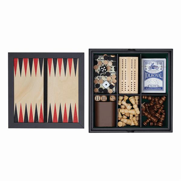Zestaw gier FAMILY-FUN. Szachy, tryk-trak, warcaby, domino, karty i kości zapakowane w drewniane pudełko.