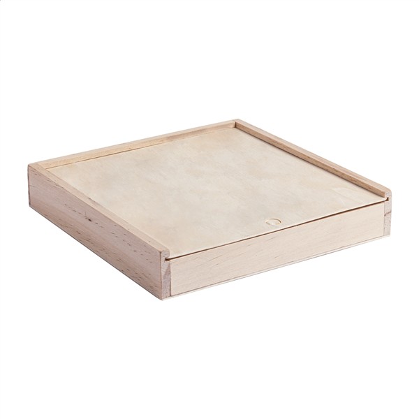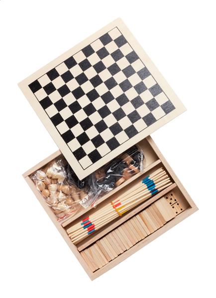 Drewniany zestaw gier zawierający: szachy, domino, mikado i warcaby.