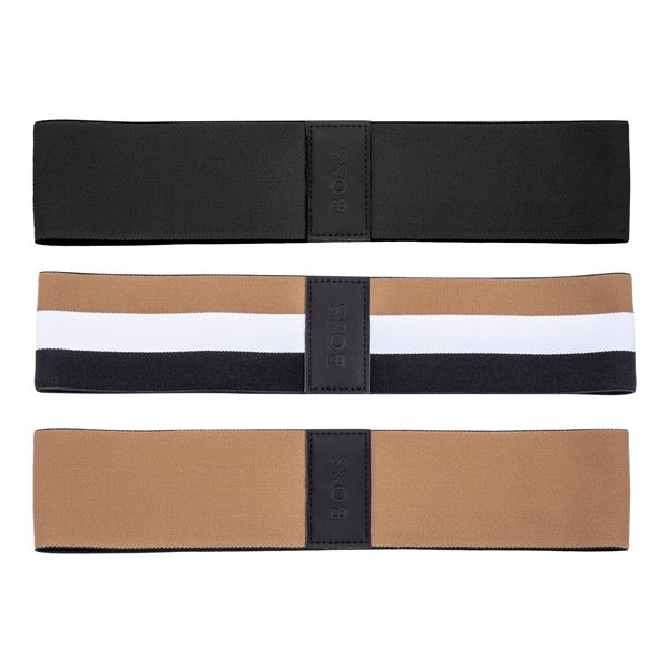 Ten zestaw 3 opasek oporowych przyniesie doskonałe wykończenie każdego stroju aktywnego BOSS. Wyposażone w trójkolorowe paski ikoniczne i wykończone luksusową matową teksturą, opaski zapewniają nutę elegancji w każdej aktywności sportowej. Wykonane z nylonu i lateksu, opaski są przeznaczone do użycia podczas każdego ćwiczenia fizycznego. Każda opaska ma wysokość 6,5 cm. Opaska camel ma wytrzymałość 9Kg, tricolor – 14Kg, a black – 21Kg.