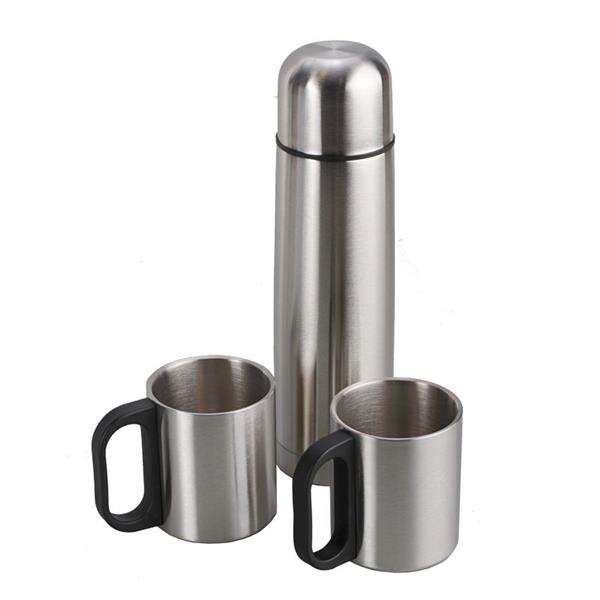 Zestaw izotermiczny składający się z torby izotermicznej na ramię, termosu o podwójnych ściankach o pojemności 450 ml i dwóch kubków o pojemności 180 ml. Wewnątrz naczyń stal 18/8 o podwyższonej jakości. Utrzymuje temperaturę przez 20 godzin.