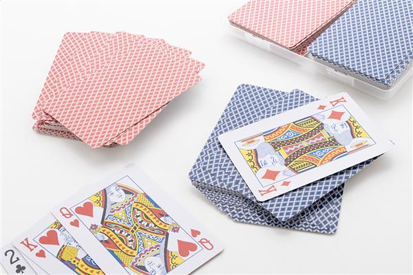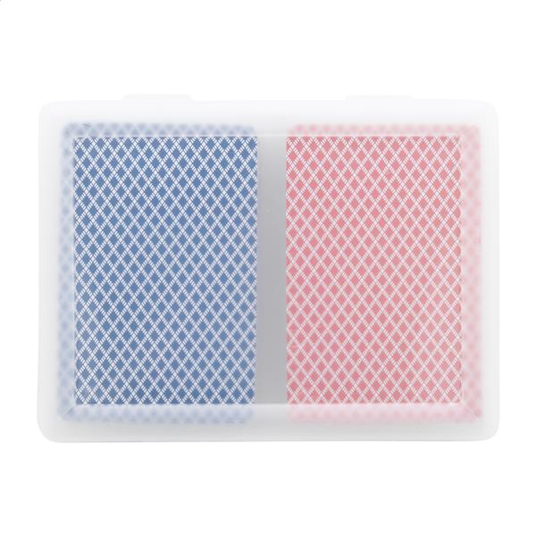 Zestaw klasycznych papierowych kart do gry w pudełku PP z recyklingu. Zawiera dwie standardowe talie 54 kart z czerwonymi i niebieskimi rewersami.