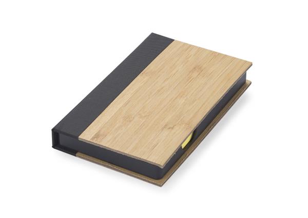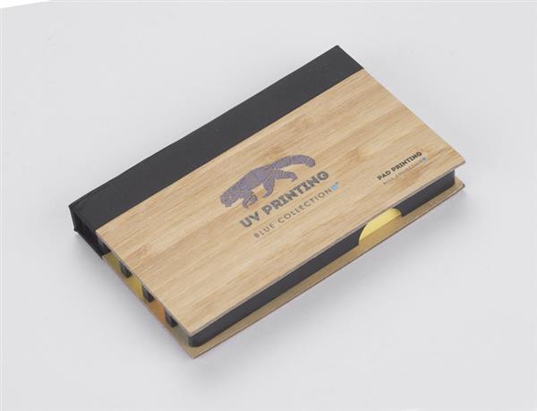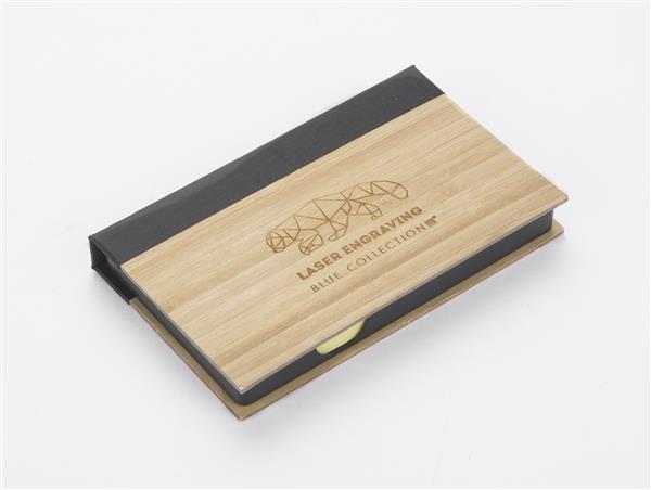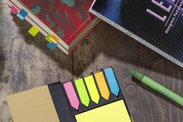 Praktyczny zestaw karteczek na biurko. Zestaw zawiera żółte samoprzylepne karteczki do zapisków a także 5 kolorowych karteczek do zaznaczania. Etui wykonane z bambusa.