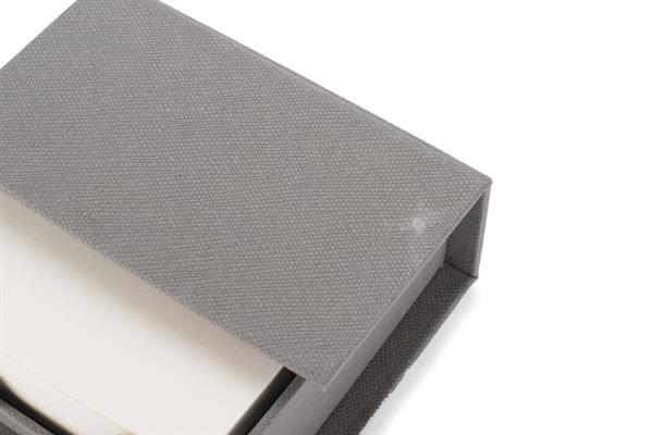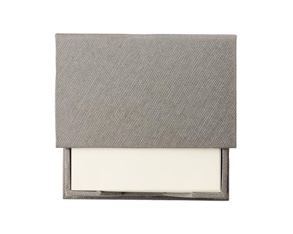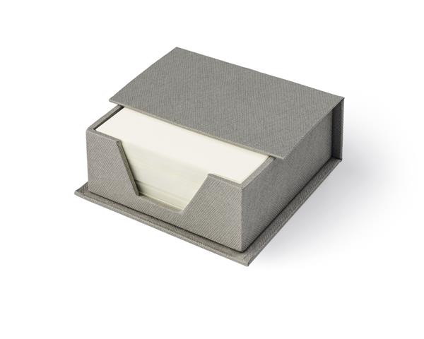 Praktyczna kostka z zestawem karteczek na biurko wykonana z szarego papieru o teksturze drobnej kratki. Kostka zawiera 300 luźnych kartek na notatki. Na wewnętrznej stronie wieczka przyklejone karteczki memo w pięciu kolorach.
