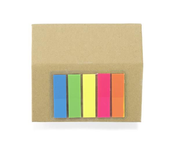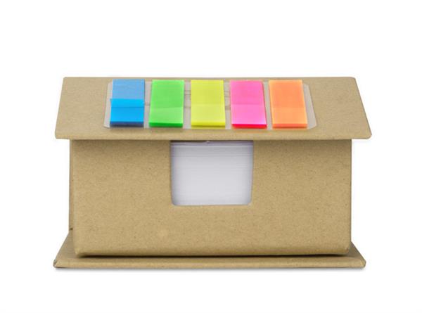 Ekologiczny pojemnik na karteczki ( 370 szt.) w kształcie domku. Dodatkowo znaczniki samoprzylepne w pięciu kolorach (po 25 znaczników w każdym kolorze). Logo wykonamy na powierzchni dachu.