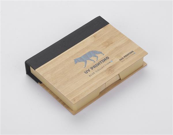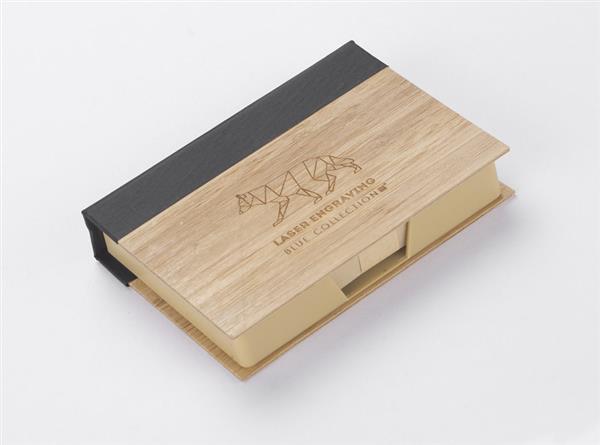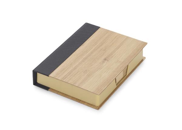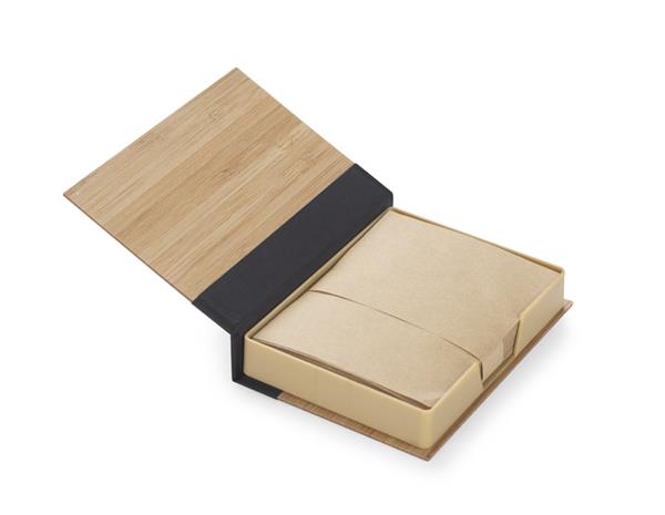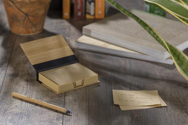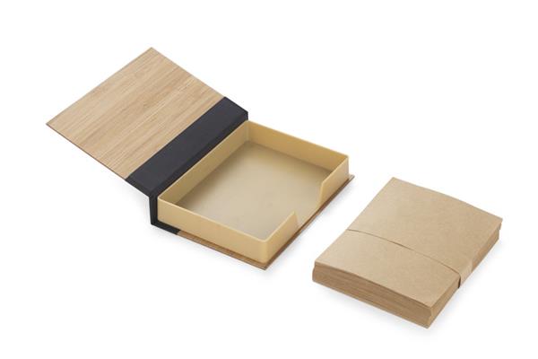 Zestaw karteczek na biurko zapakowany w etui wykonane z bambusa. W zestawie znajdują się brązowe karteczki do zapisków.