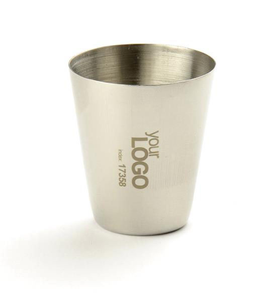 Cztery kieliszki stalowe o pojemności 30 ml pakowane w etui z materiału skóropodobnego (PU) PU zapinanego na zamek. Logo grawerujemy na powierzchni kieliszków.