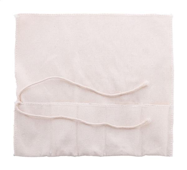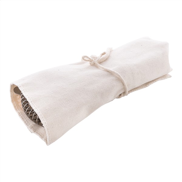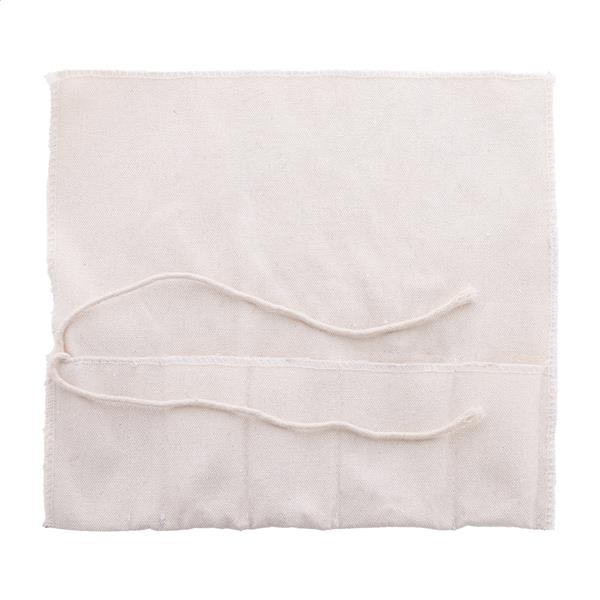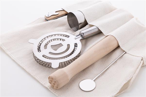 5-częściowy zestaw do koktajli w praktycznym, zwijanym bawełnianym woreczku. Zawiera: stalowy jigger, sitko i łyżkę barmańską, korkociąg z drewnianą rączką i drewniany tłuczek.
