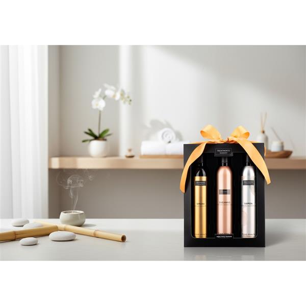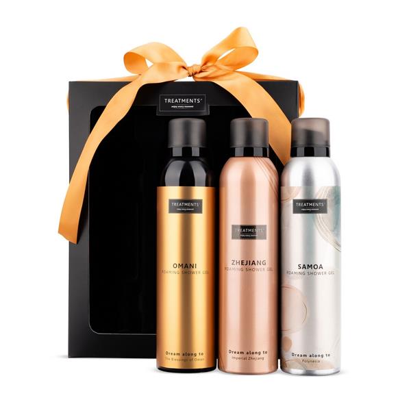 Zestaw kosmetyków Foaming Extravagance TREATMENTS, przeznaczony dla kobiet i mężczyzn, w zestawie znajdują się 3 pieniące się żele pod prysznic 200 ml, różne zapachy: Omani, Samoa, Zhejiang, sprawdzą się w codziennej pielęgnacji, żele zapakowane są elegancki kartonik. Znakowanie produktu jest możliwe tylko na srebrnej lub złotej folii z czarnym nadrukiem albo na czarnej apli ze srebrnym lub złotym nadrukiem.