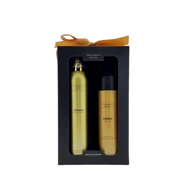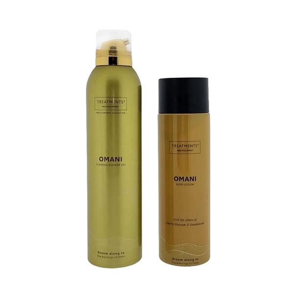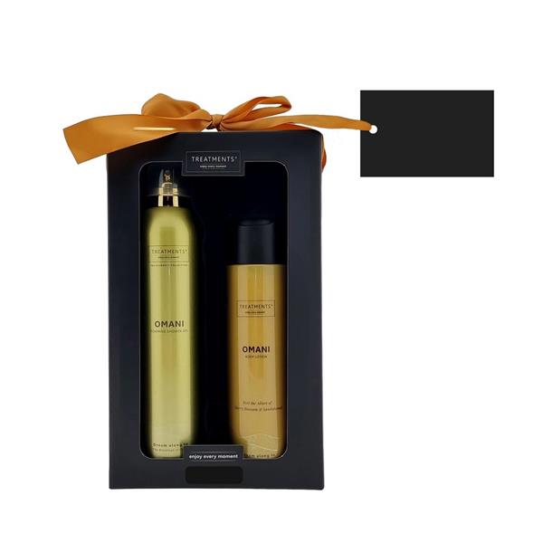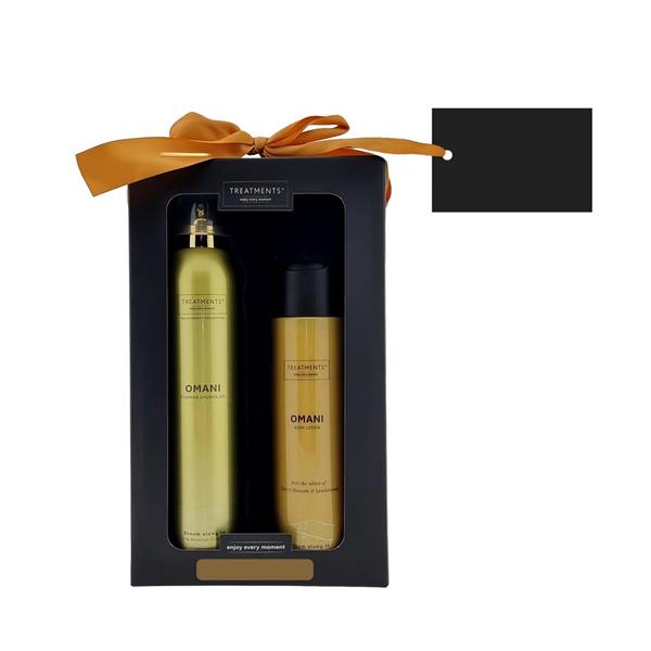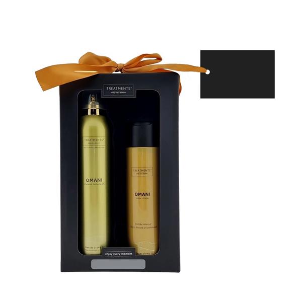 Zestaw kosmetyków Tenderness TREATMENTS, przeznaczony dla kobiet i mężczyzn, w zestawie znajduje się: pieniący się żel pod prysznic 200 ml, balsam do ciała 250 ml, elegancki, papierowy kartonik, w którym zapakowane są kosmetyki, sprawdzą się w codziennej pielęgnacji, dostępne są różne warianty zapachowe: 03 – Ceylon, 06 – Mahayana, 08 – Omani, 11 – Uyuni, 16 – Zhejinag, 19 – Shinshiro, 21 – Verona, 98 – Samoa. Znakowanie produktu jest możliwe tylko na srebrnej lub złotej folii z czarnym nadrukiem albo na czarnej apli ze srebrnym lub złotym nadrukiem.