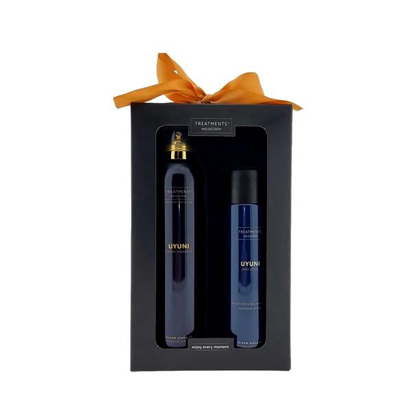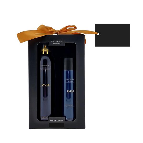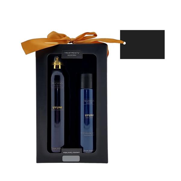 Zestaw kosmetyków Tenderness TREATMENTS, przeznaczony dla kobiet i mężczyzn, w zestawie znajduje się: pieniący się żel pod prysznic 200 ml, balsam do ciała 250 ml, elegancki, papierowy kartonik, w którym zapakowane są kosmetyki, sprawdzą się w codziennej pielęgnacji, dostępne są różne warianty zapachowe: 03 – Ceylon, 06 – Mahayana, 08 – Omani, 11 – Uyuni, 16 – Zhejinag, 19 – Shinshiro, 21 – Verona, 98 – Samoa. Znakowanie produktu jest możliwe tylko na srebrnej lub złotej folii z czarnym nadrukiem albo na czarnej apli ze srebrnym lub złotym nadrukiem.