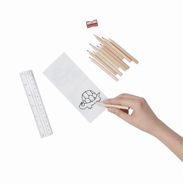 Zestaw kredek BEING BUSY zawiera książkę z obrazkami do kolorowania, 10 kredek, 15 cm linijkę i temperówkę, naostrzone.