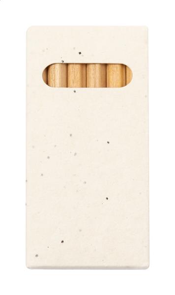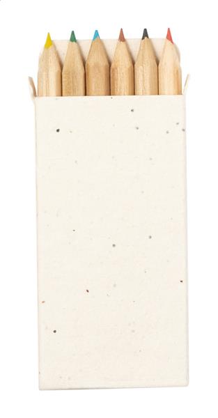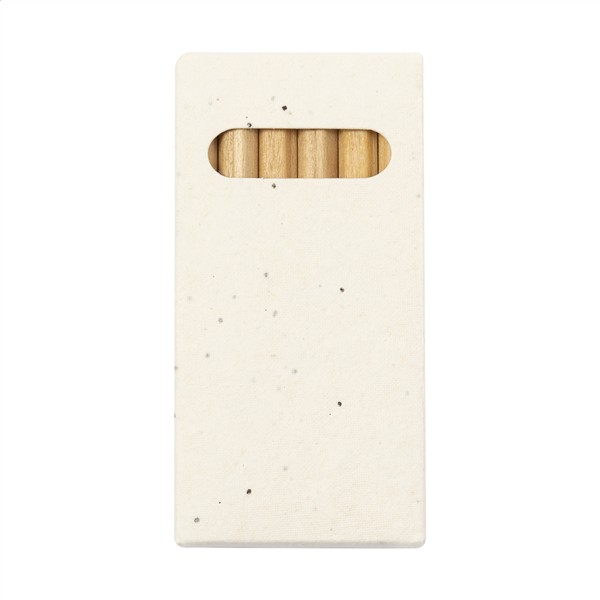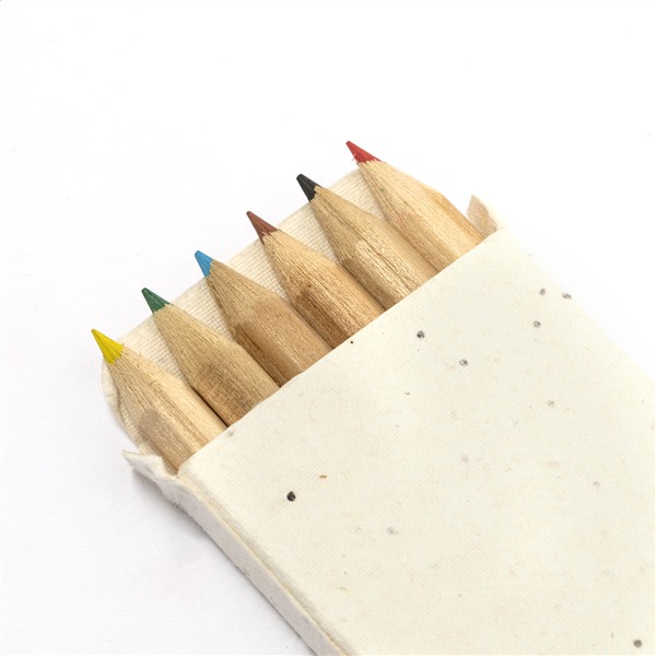 Zestaw 6 drewnianych kredek w pudełku z papieru nasiennego. Pudełko z papieru nasiennego zawiera nasiona petunii w różnych kolorach, które można zasadzić po użyciu.