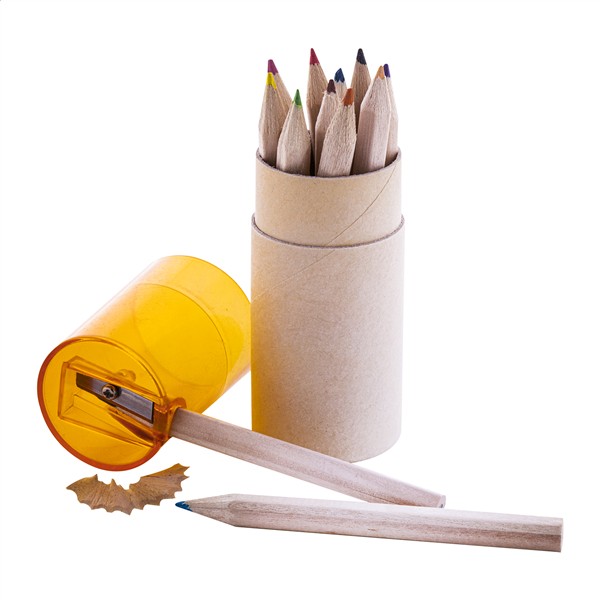 12szt kolorowych kredek w okrągłym, kartonowym pudełku z plastikową pokrywką/temperówką.