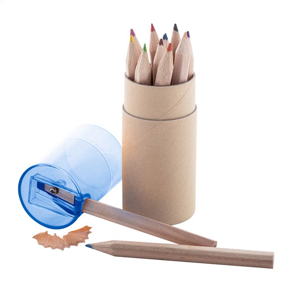 12szt kolorowych kredek w okrągłym, kartonowym pudełku z plastikową pokrywką/temperówką.