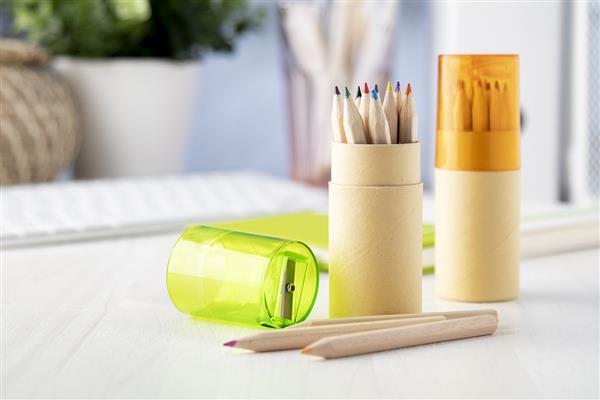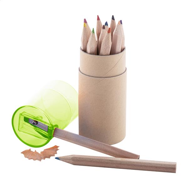 12szt kolorowych kredek w okrągłym, kartonowym pudełku z plastikową pokrywką/temperówką.