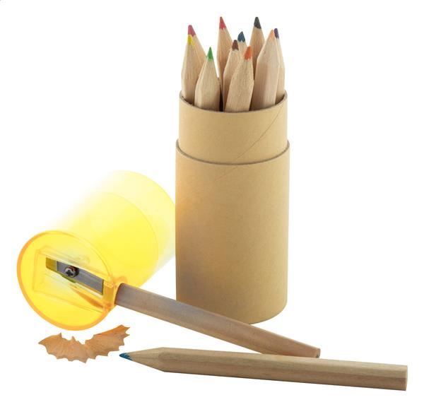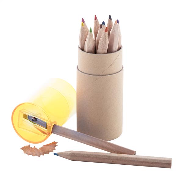 12szt kolorowych kredek w okrągłym, kartonowym pudełku z plastikową pokrywką/temperówką.