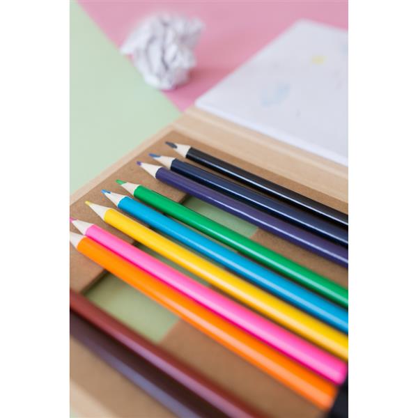 Zestaw do kolorowania, zawiera 12 drewnianych kredek ołówkowych oraz 50 kartek w opakowaniu wykonanym z kartonu