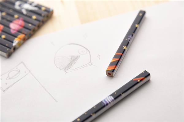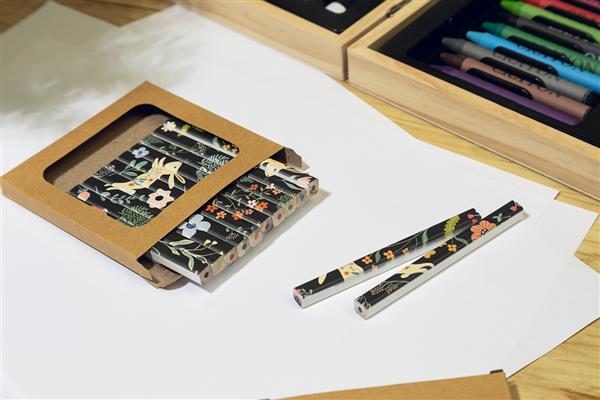 Zestaw 12 prostokątnych drewnianych kredek ołówkowych z białym wykończeniem. W pudełku z papieru kraft z dużym okienkiem. Idealny do nadruku UV LED na całej powierzchni.