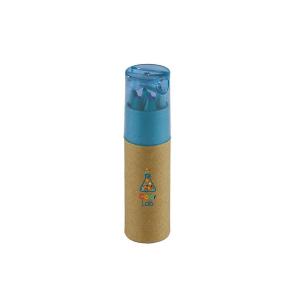 Zestaw 6 kredek w okrągłym pudełku zamykanym kolorową zatyczką z wbudowaną temperówką, produkt wykonany z kartonu z recyklingu