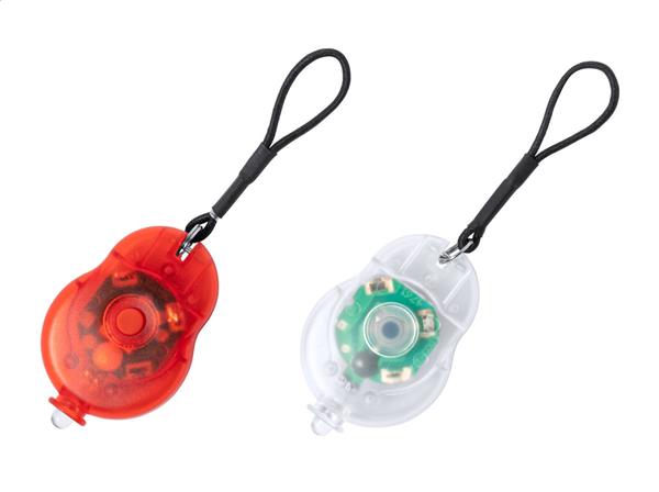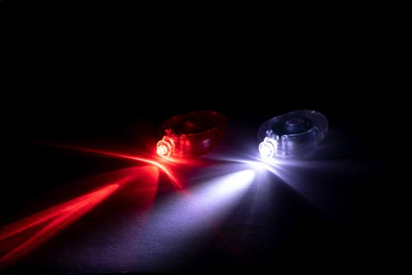 2-częściowy zestaw lampek rowerowych w plastikowej etui PP. Zawiera 1 białą i 1 czerwoną diodę LED z elastycznymi paskami i 2 trybami świecenia. Z 2 bateriami guzikowymi.