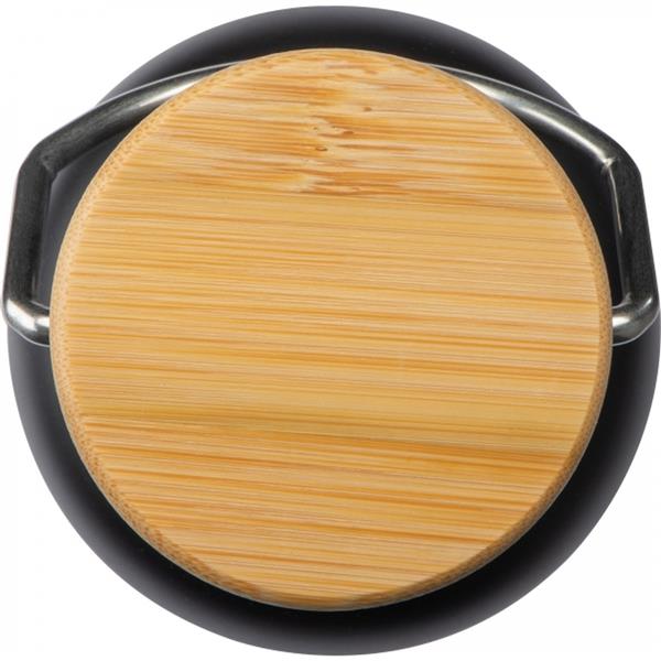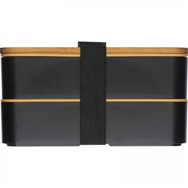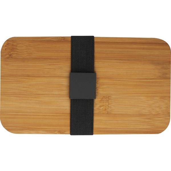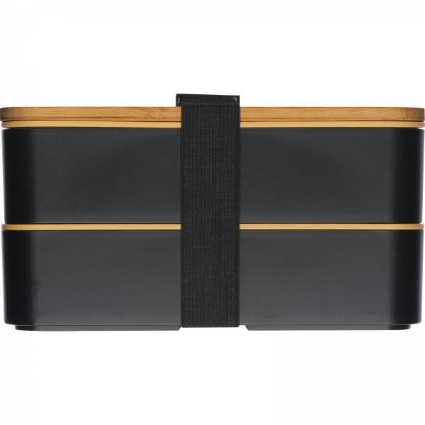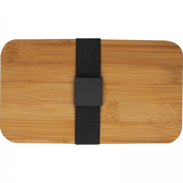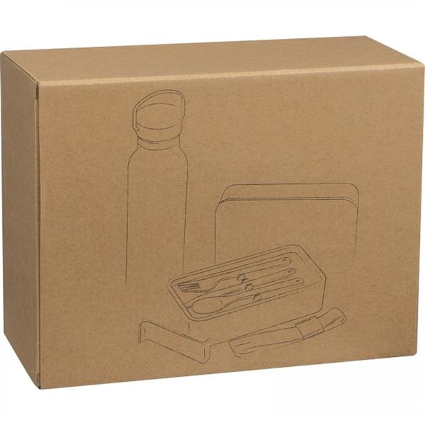 Zestaw zawierający termos próżniowy i dwupoziomowe pudełko na lunch ze sztućcami i z ruchomą przegródką pozwalającą dowolnie dzielić pudełko na 2 komory. Całość spięta gumką. Zestaw wykonany ze stali nierdzewnej, włókien pszennych i bambusa.