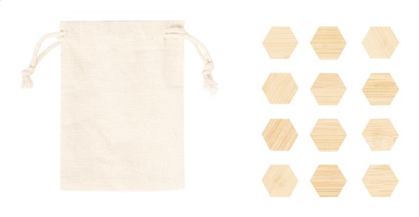 12-częściowy zestaw bambusowych magnesów na lodówkę, w bawełnianym etui ze sznurkiem.