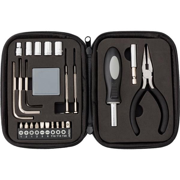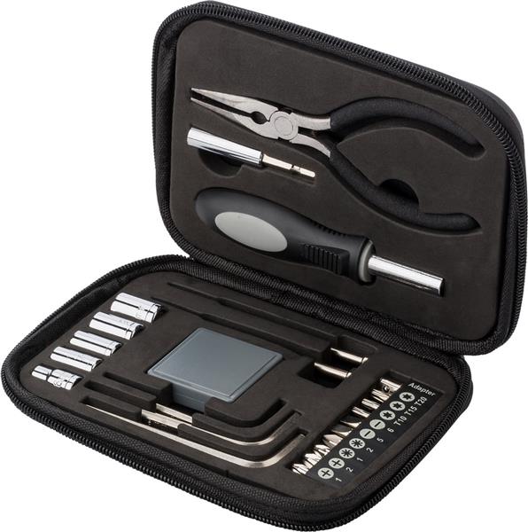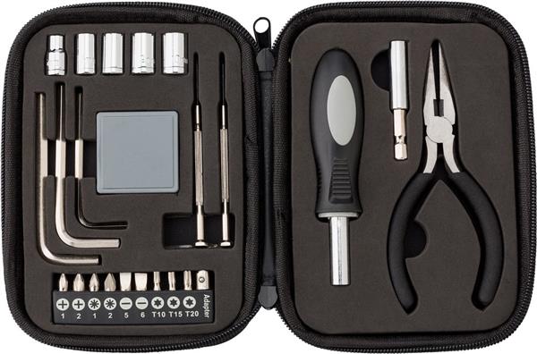 Zestaw narzędzi 24 el., 5 kluczy nasadowych, 3 wkrętaki sześciokątne, 9 końcówek wkrętakowych, 1 nasadka, 1 miara, 2 wkrętaki precyzyjne, 1 uchwyt do śrubokręta, 1 przedłużka, 1 szczypce, w skórzanym etui na zamek błyskawiczny