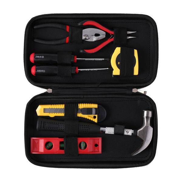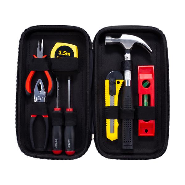 Zestaw narzędzi w etui zapinanym na zamek. Zestaw składa się z: młotka, poziomicy, nożyka introligatorskiego, zwijanej 3,5 m miarki wyposażonej w mechanizm blokujący oraz szczypiec długich, szczypiec z przegubem ślizgowym, płaskiego śrubokręta i śrubokręta krzyżakowego. Podziałka w centymetrach i calach.