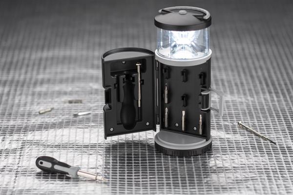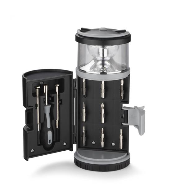 Zestaw narzędzi BARTO to zestaw w kształcie latarni zawierający śrubokręt z 8 bitami, 2 śrubokręty precyzyjne i lampka LED, pełniąca ciekawą funkcję lampki kempingowej. Posiada uchwyt do zawieszenia lub przenoszenia. Lampka jest zasilana bateriami 3xAAA. Baterie nie są dołączone.