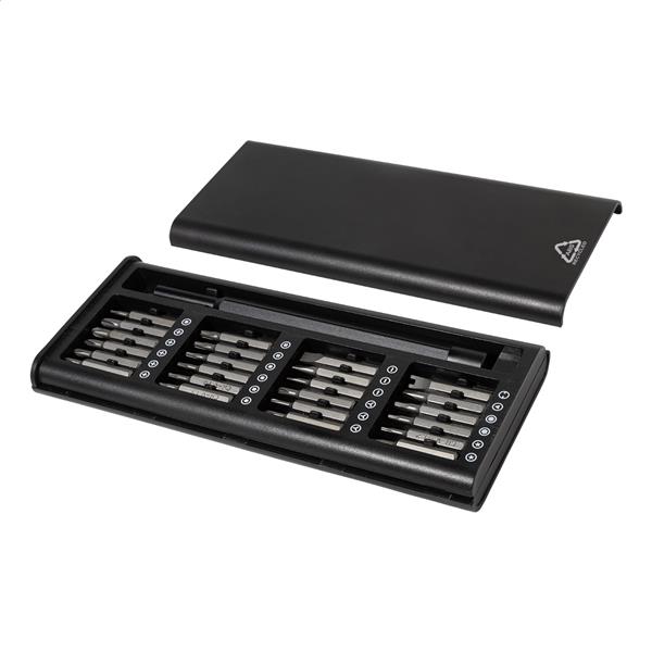 Zestaw precyzyjnych wkrętaków z 24 bitami w etui z recyklingowanego tworzywa ABS. Rękojeść wkrętaka wyposażona jest w magnetyczny uchwyt na bity, umożliwiający szybką i bezpieczną wymianę bitów. Primary Color: czarny Material 1: ABS z recyklingu Rozmiar: 158×67×16 mm