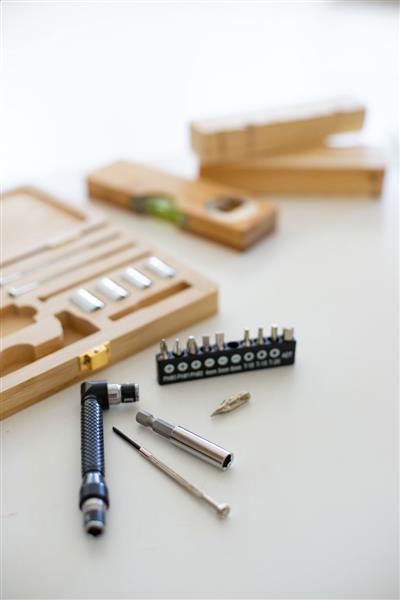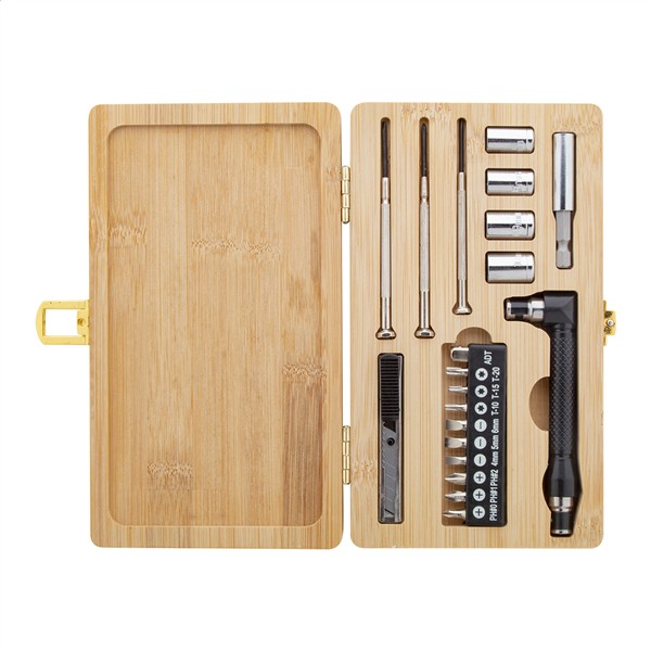 21-częściowy metalowy zestaw narzędzi w bambusowym pudełku. Zawiera 1 śrubokręt nasadowy, 1 nóż do tapet, 3 precyzyjne śrubokręty, 10 szt. bitów, 4 szt. nakładek i 1 przedłużka.