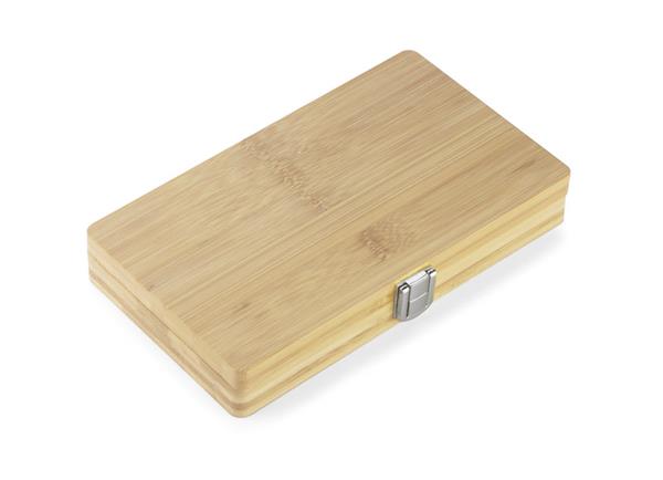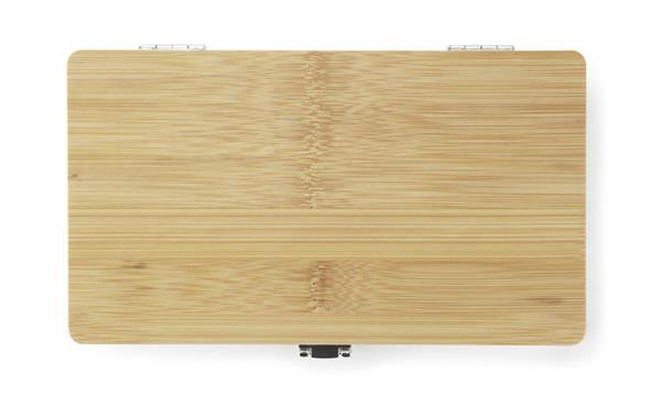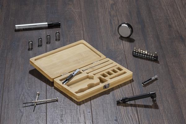 MAD to zestaw narzędzi w bambusowej obudowie. Zestaw zawiera: wkrętak, dziesięć różnych bitów, przedłużkę, cztery nasadki (7 mm, 8 mm, 9 mm i 10 mm), trzy wkrętaki precyzyjne oraz nożyk do tapet. Obudowa zamykana na metalowy zatrzask.