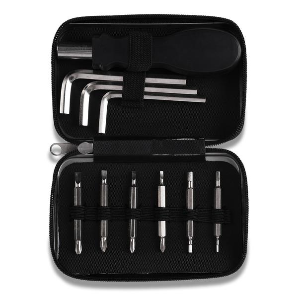 Zestaw narzędzi w metalowym etui zamykanym na zamek. Zestaw składa się z 6 wkrętaków o podwójnym zakończeniu. W ich skład wchodzą: 4 końcówki imbusowe, 4 płaskie śrubokręty (4 mm) + 4 śrubokręty krzyżowe (Phillips, 4 mm) oraz 3 klucze imbusowe i uchwyt wkrętakowy (4 mm).