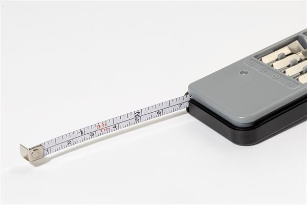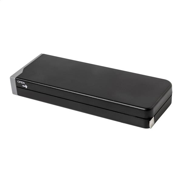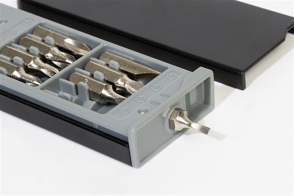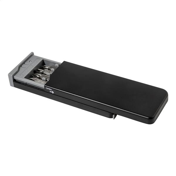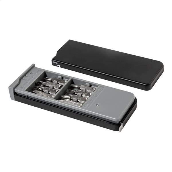 Kompaktowy zestaw narzędzi w walizce z recyklingowanego tworzywa ABS z 8 końcówkami wkrętakowymi i wbudowaną 1-metrową taśmą mierniczą.