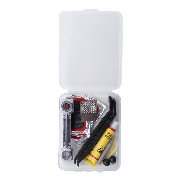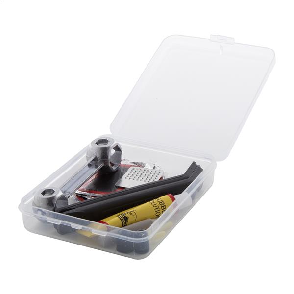 Zestaw naprawczy do rowerów w przezroczystym plastikowym etui z PP. Zawiera klucz imbusowy i zestaw do naprawy przebitych opon (2 łyżki do opon, tarkę, klej, 2 kapturki na zawory, 2 rurki na zawory i 5 łatek na opony).
