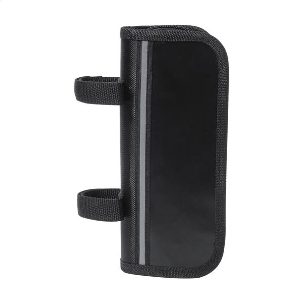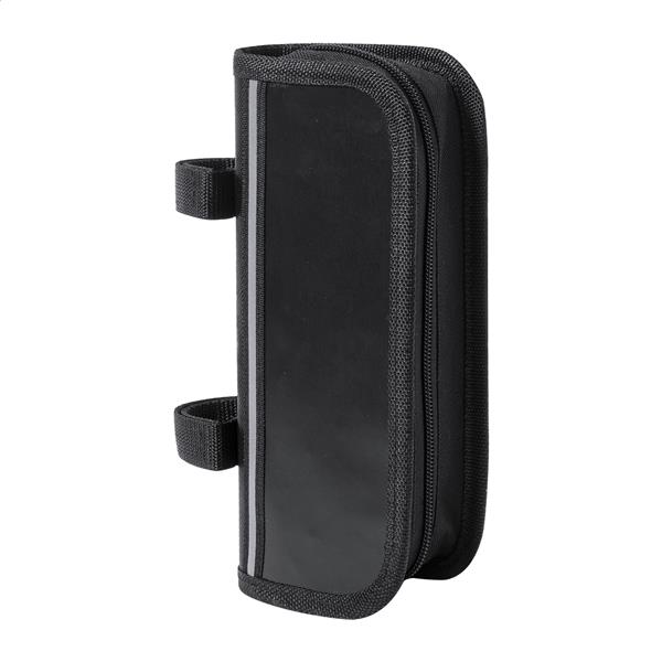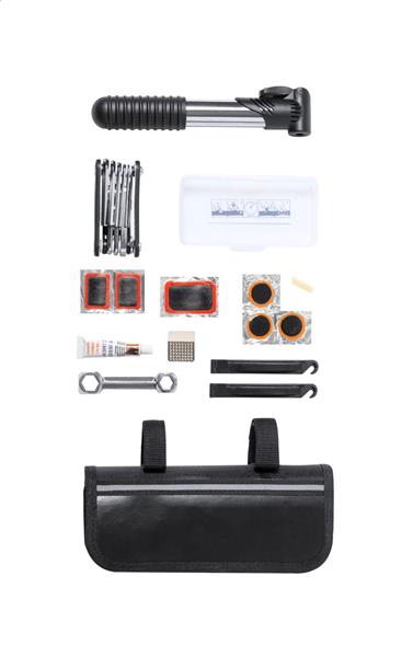 Zestaw naprawczy do roweru w praktycznej torbie na ramę rowerową z Poliester 600D. Zawiera: 15-funkcyjny multi tool, klucz imbusowy, mini pompkę i zestaw naprawczy do opon (2 łyżki do opon, tarkę i 6 łatek).