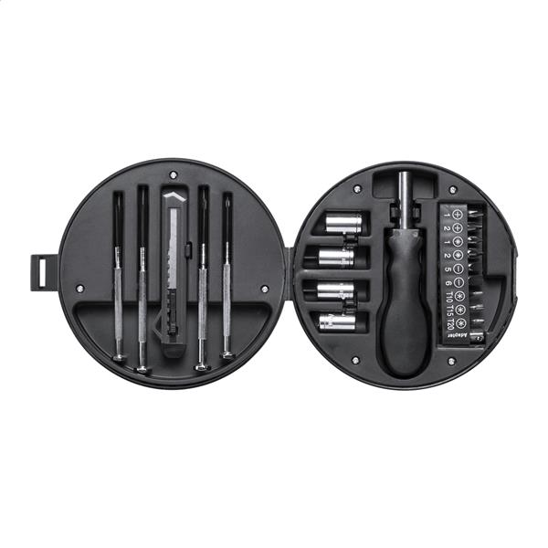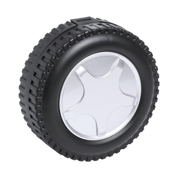 20-elementowy zestaw w plastikowym etui w kształce koła samochodowego.